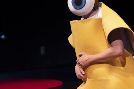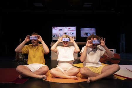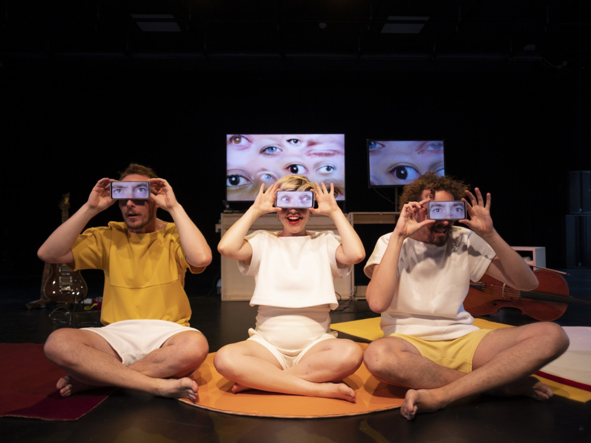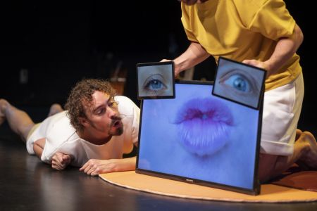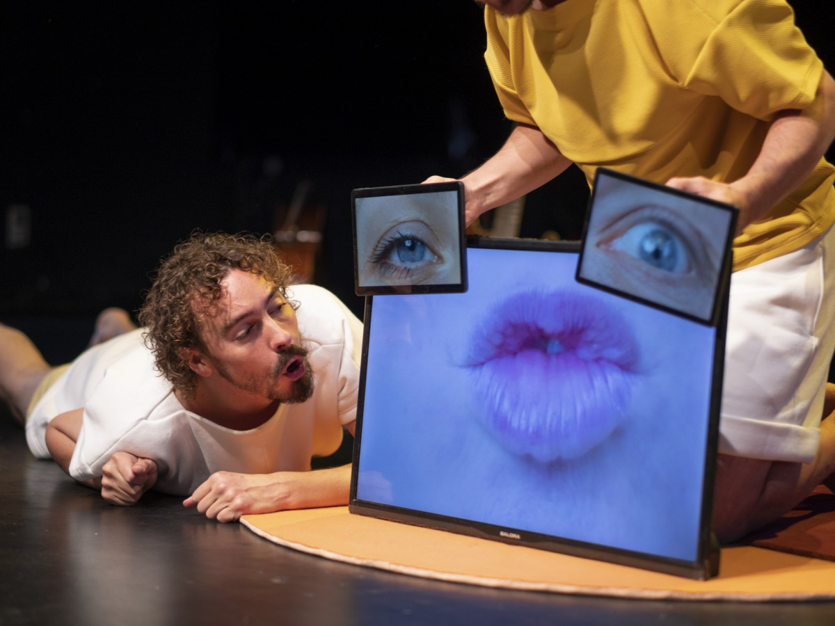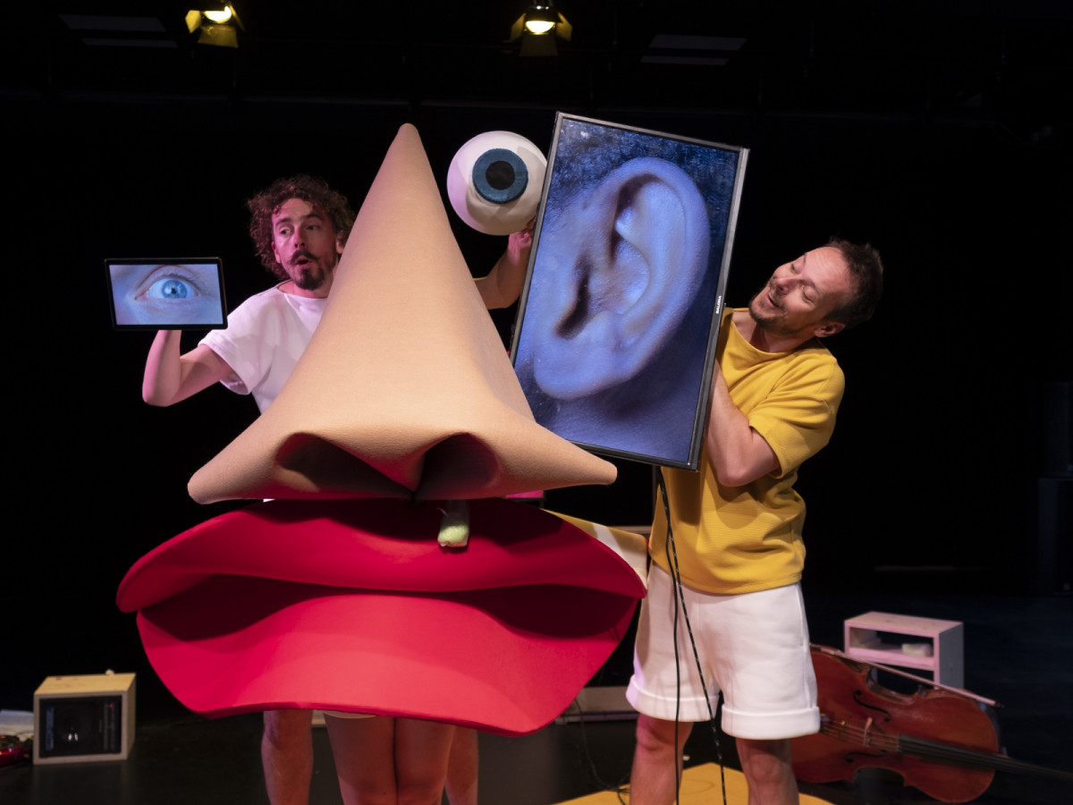Videoschermen en GSM’s worden geplaatst, verplaatst en gedraaid. Ze focussen telkens op andere delen van het aangezicht. Kleurige kostuums, omvormbaar tot een uitvergrote neus, mond, oog en oor, worden speelse elementen naast de gezongen aria’s.