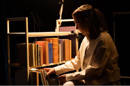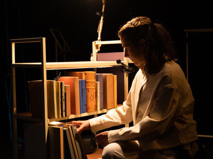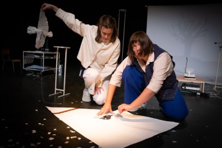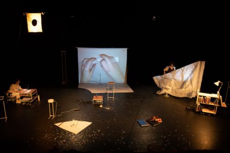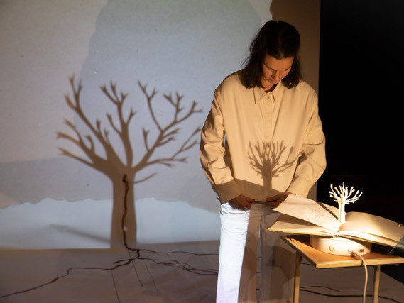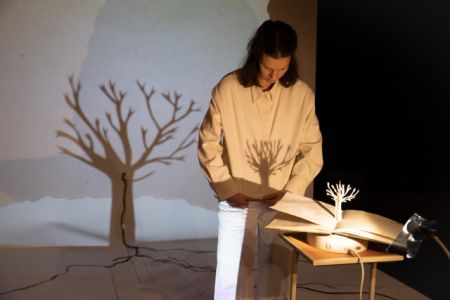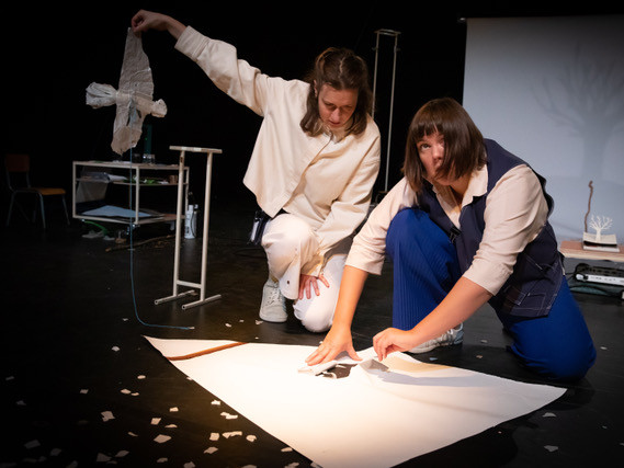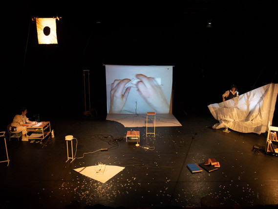 PAPIERLIED is een beeldende kleutervoorstelling die begint bij een kleine, onopvallende boekenkast. Langzaamaan ontvouwt er zich een bijzondere wereld vol schaduwspelen, pop-upmaquettes, objecten, klank en licht. Zo wekken Wanda Eyckerman en Annelies Van Hullebusch een papieren universum tot leven. Ze vouwen, knippen, scheuren en belichten. PAPIERLIED is een visuele reis die helemaal anders eindigt dan het begint.