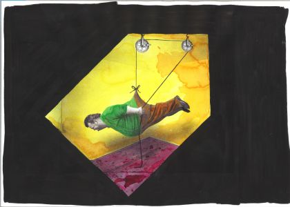 Een vrouw, een man, een kind, een huis. Het huis neemt de benen. Liggend kijk je naar het plafond van de bus, waar hun reis voorbij rolt. De bus is objectentheater tussen kitsch en houtje-touwtje.
